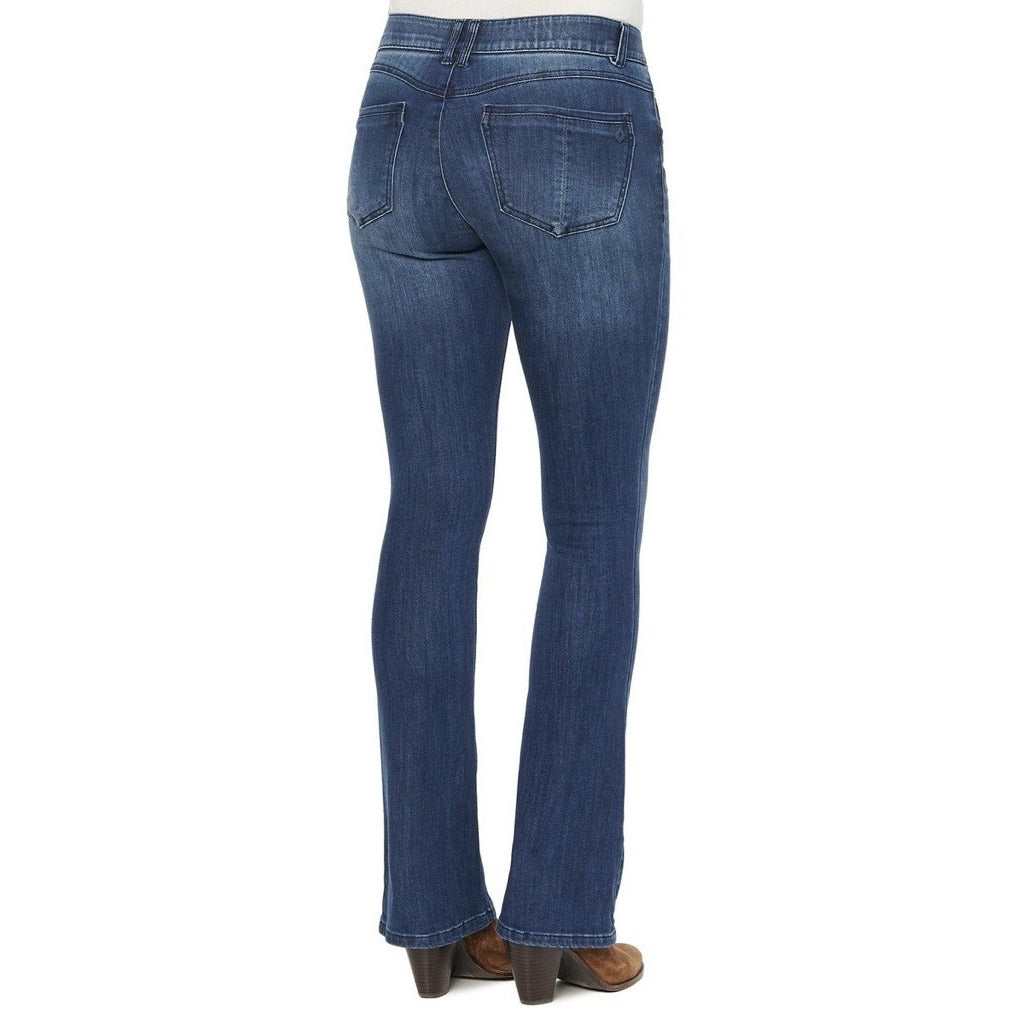 Fitted through the hips and calves; "legs-for-days" baby bootcut leg opening. 9" front rise, 32" inseam, 18" leg opening.
